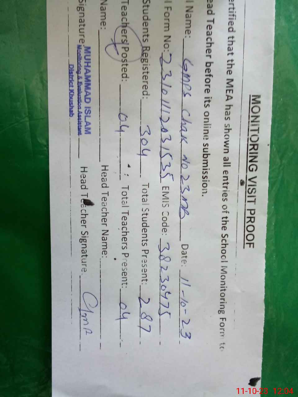| EMIS Code: 38230475 | Name of School: GMPS CHAK NO. 23 MB | |||