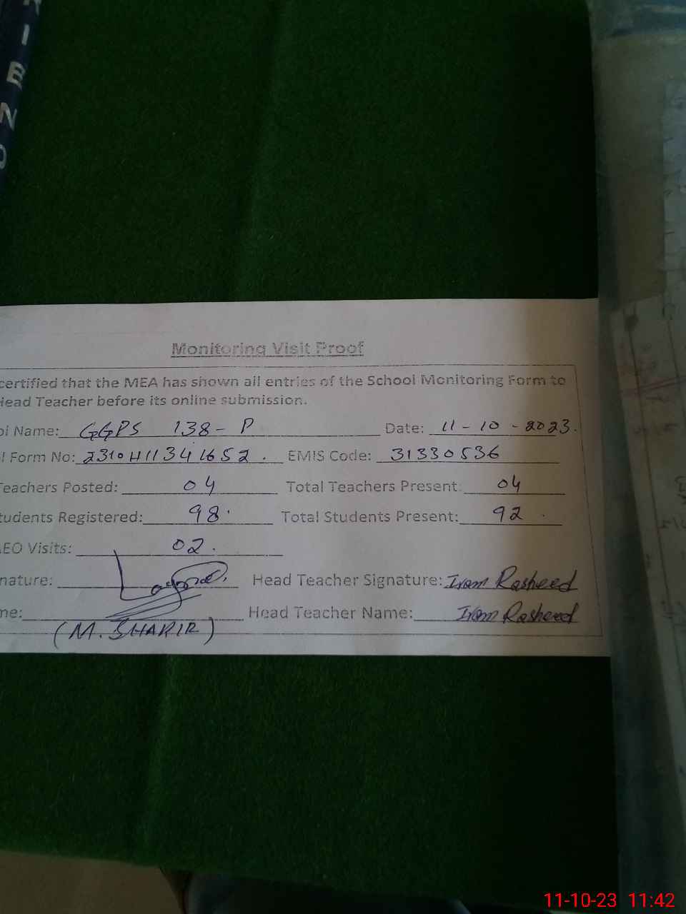 | Attendance Register | Head Teacher | MEA with School | Visit Proof |