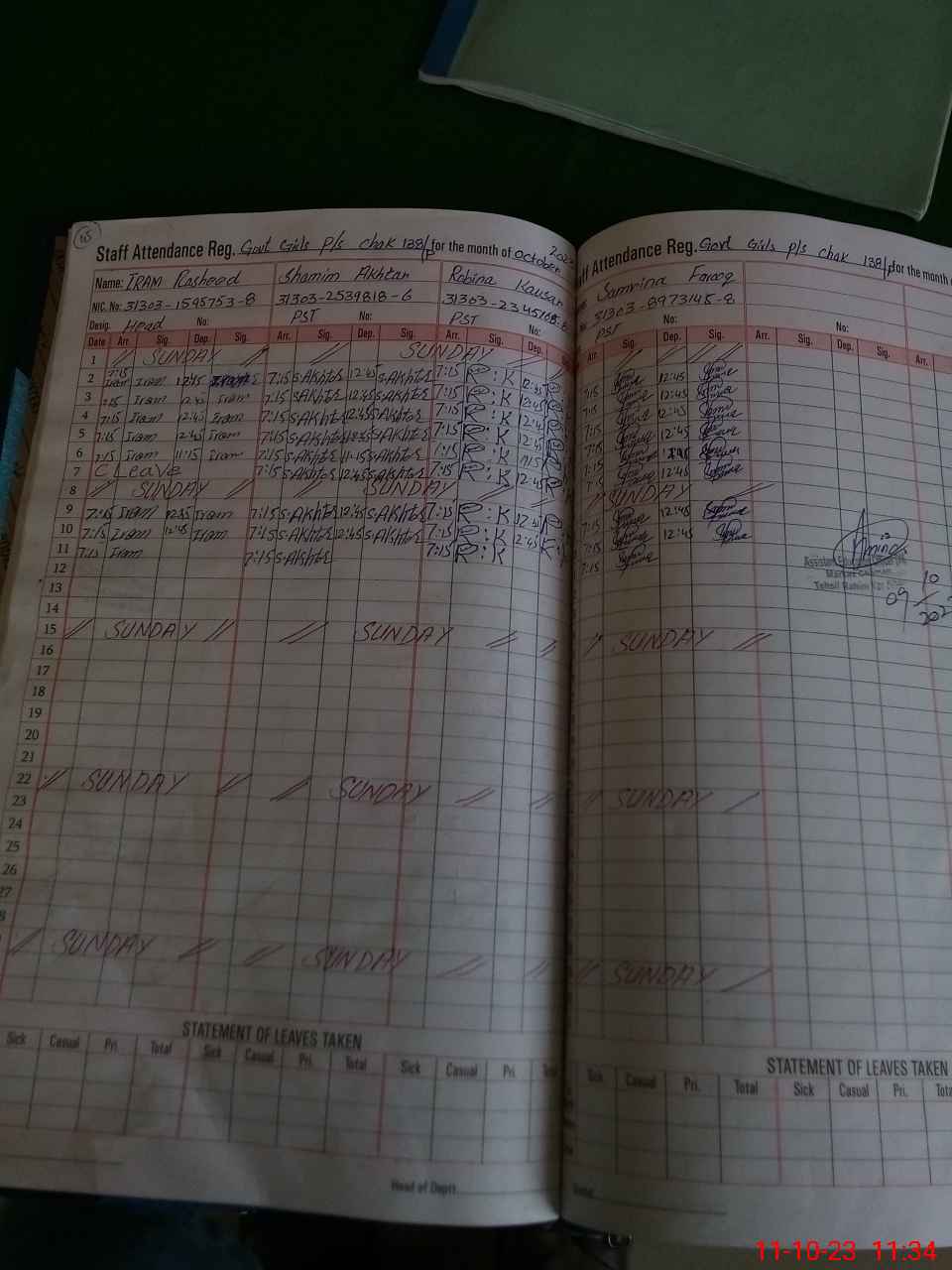 | CNIC | Full Name | Designation | R/C | Absence During Last Calender Month |