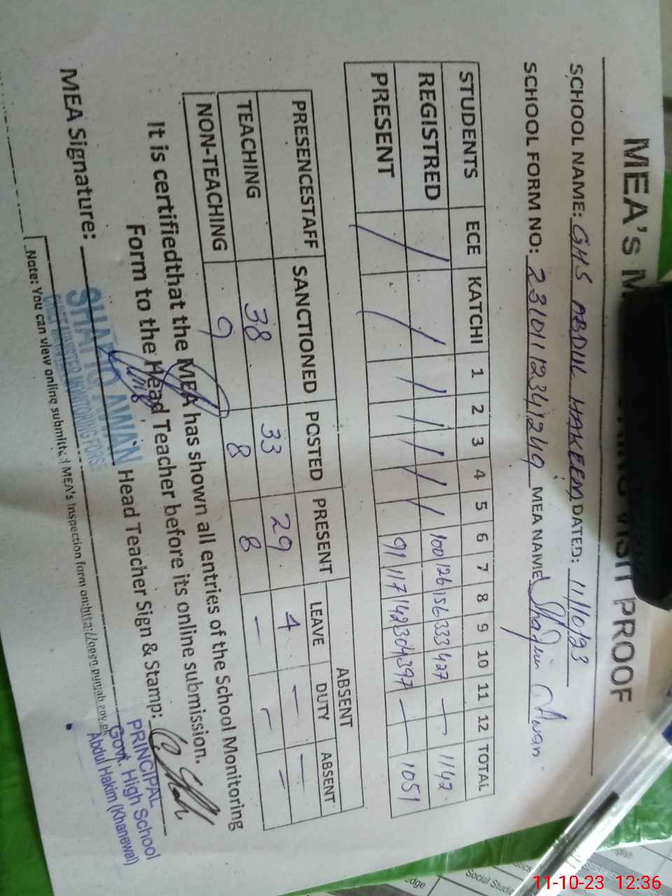 | Attendance Register | Head Teacher | MEA with School | Visit Proof |