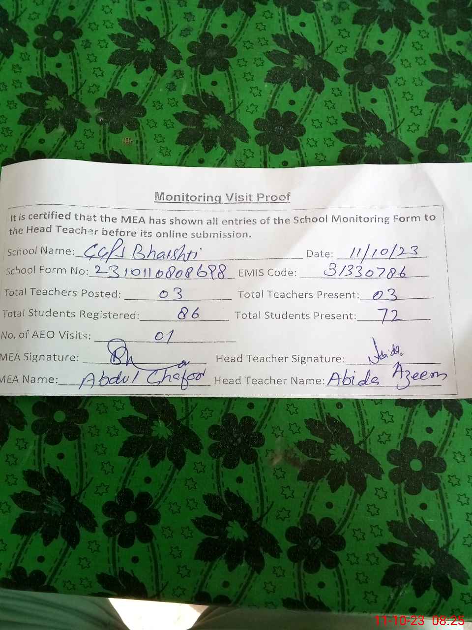 | Monitoring Date: 11-10-2023 | Start Time: 11-10-2023 07:55 AM | End Time: 11-10-2023 08:25 AM | Name of MEA: Ab**** Gh**** | |