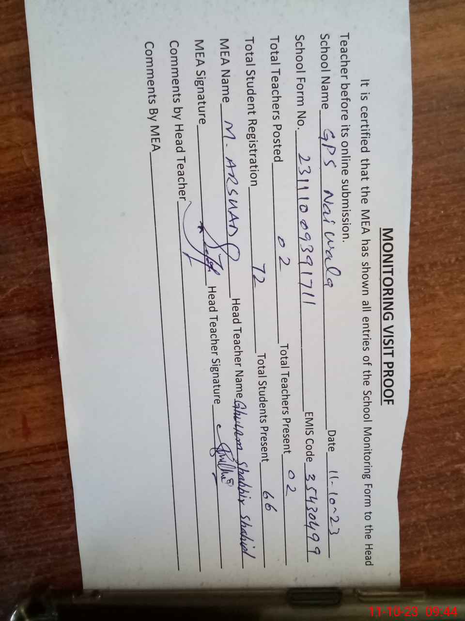 | Attendance Register | Head Teacher | MEA with School | Visit Proof |