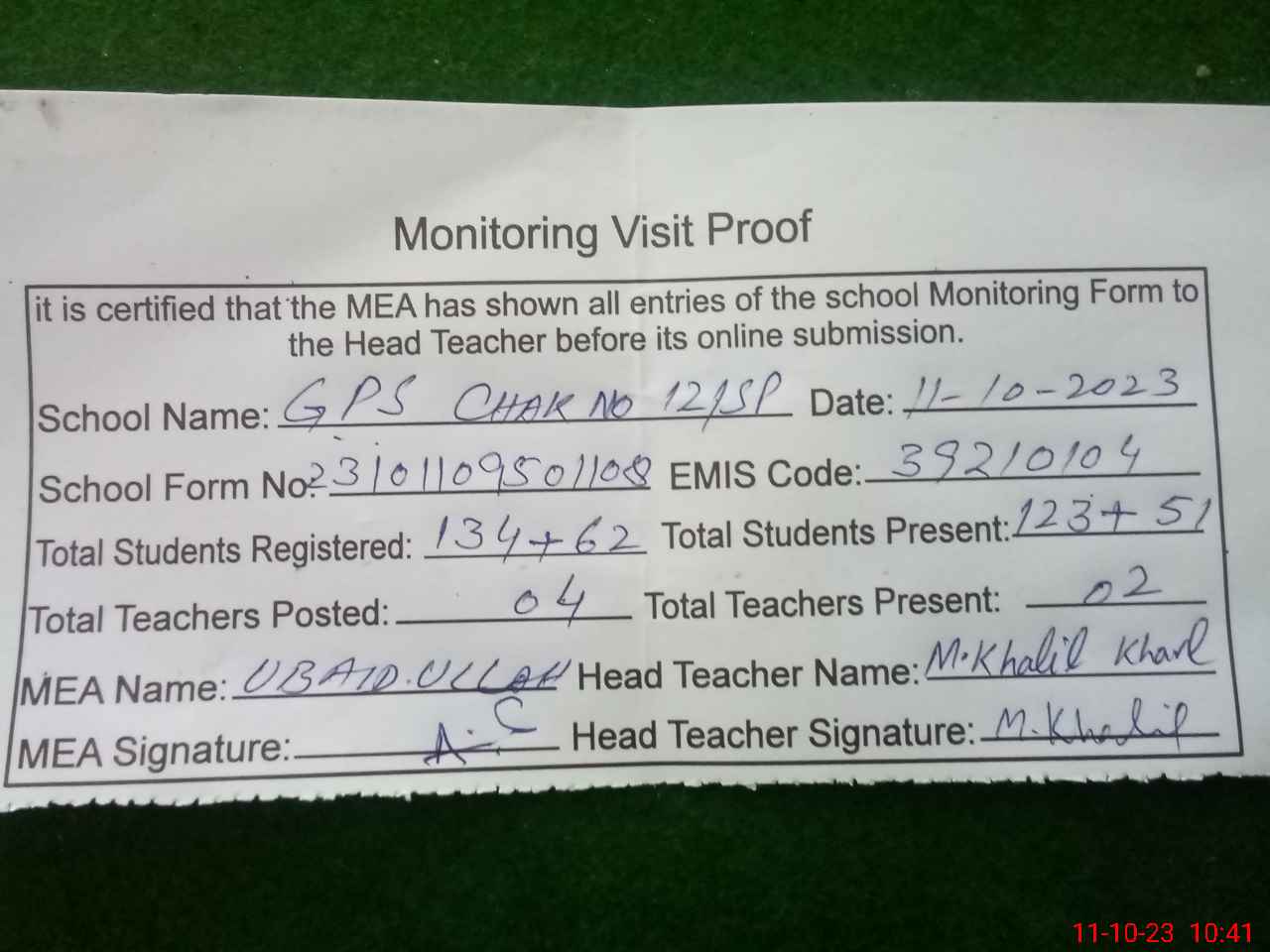 | Attendance Register | Head Teacher | MEA with School | Visit Proof |