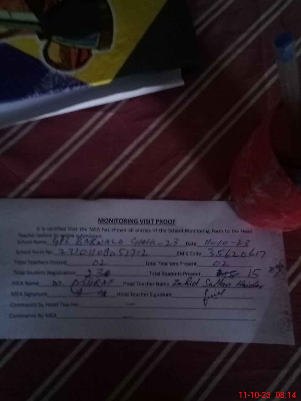 | Attendance Register | Head Teacher | MEA with School | Visit Proof |