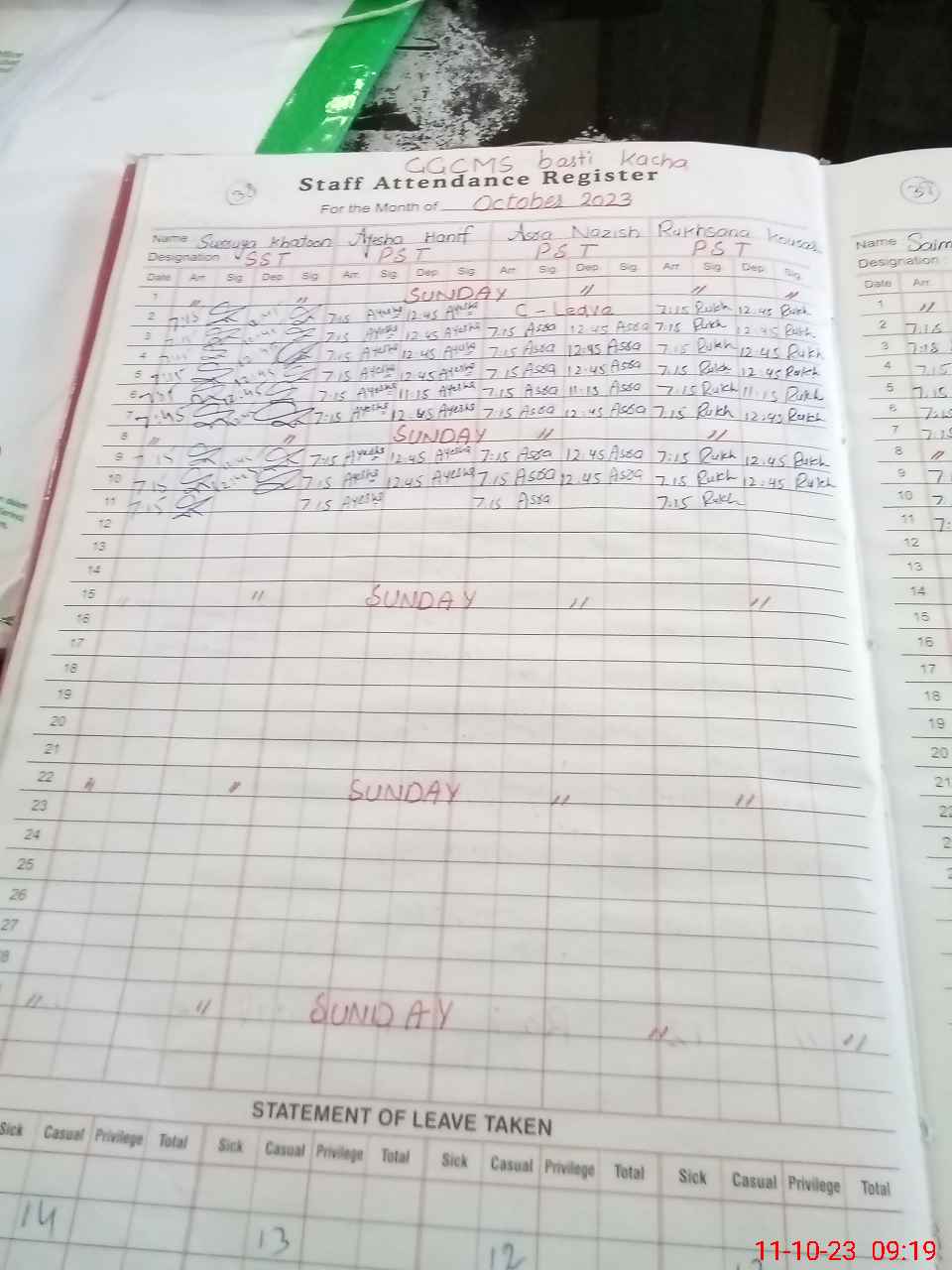 | Monitoring Date: 11-10-2023 | Start Time: 11-10-2023 09:13 AM | End Time: 11-10-2023 09:46 AM | Name of MEA: Sa**** Hu**** | |