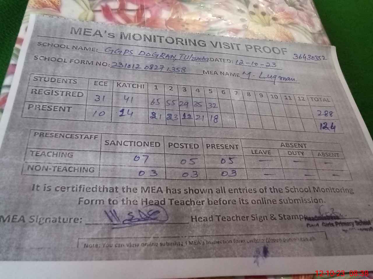 | Attendance Register | Head Teacher | MEA with School | Visit Proof |