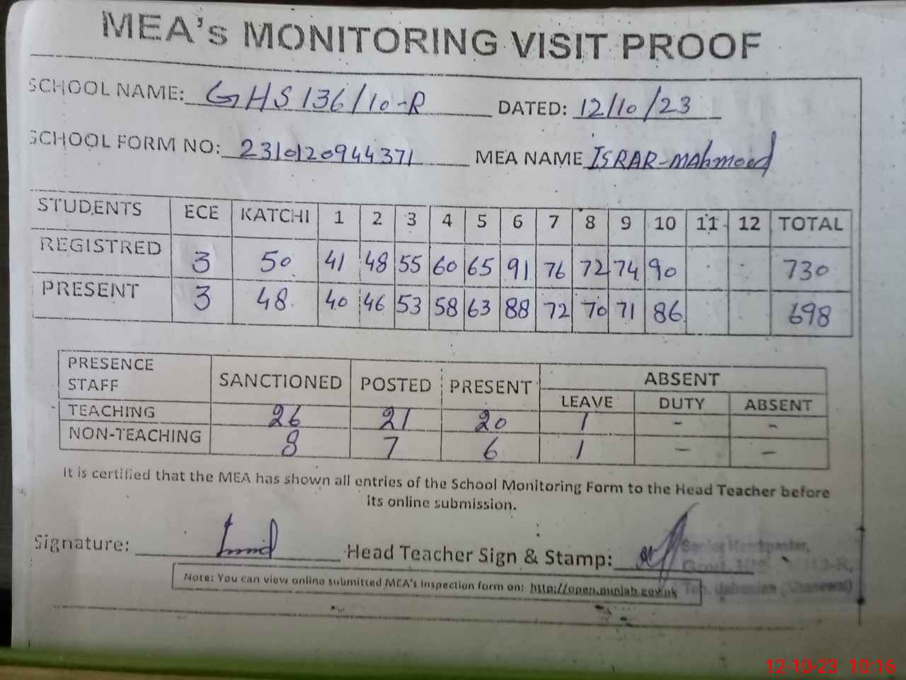 | Attendance Register | Head Teacher | MEA with School | Visit Proof |