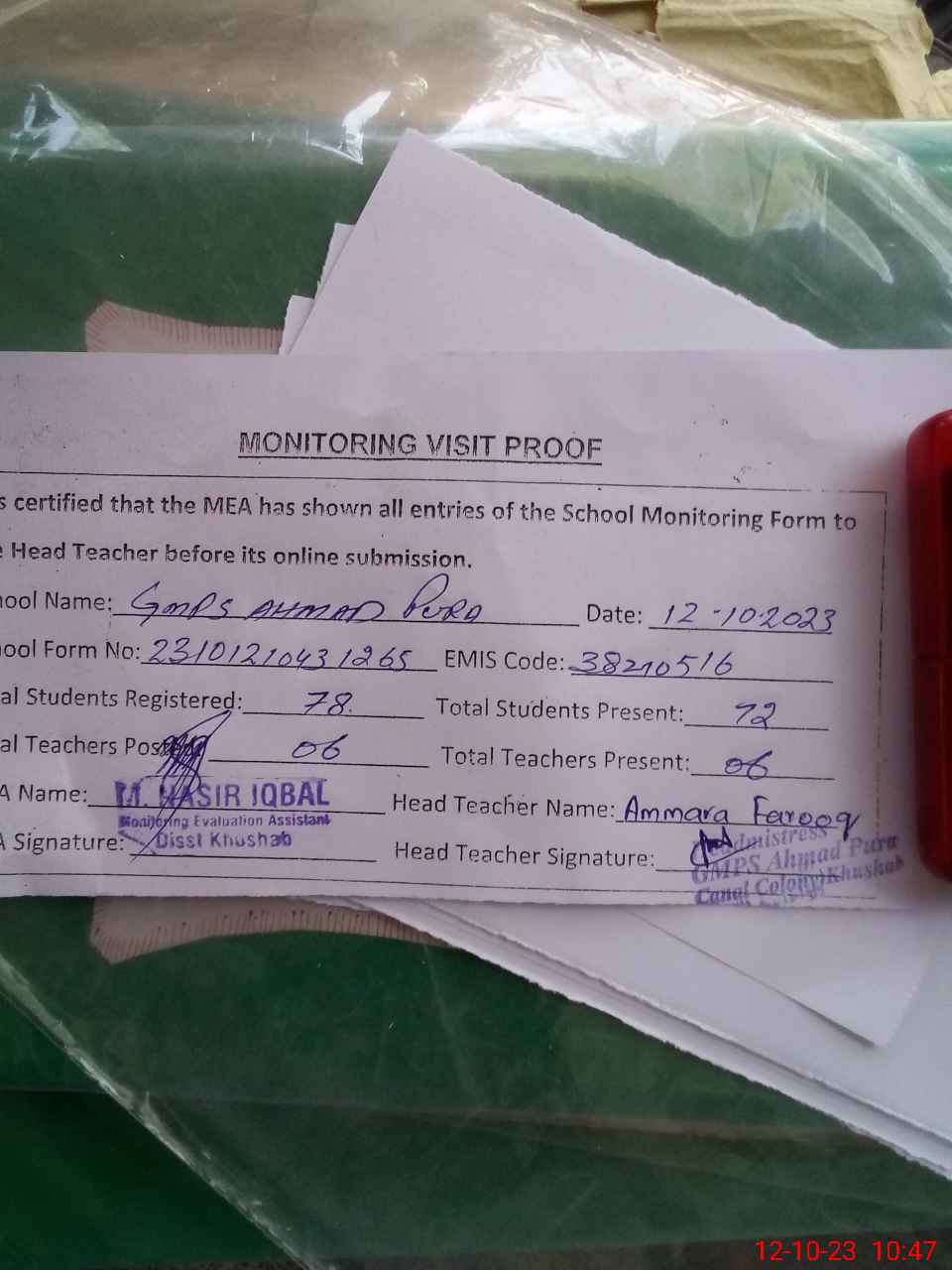 | Attendance Register | Head Teacher | MEA with School | Visit Proof |