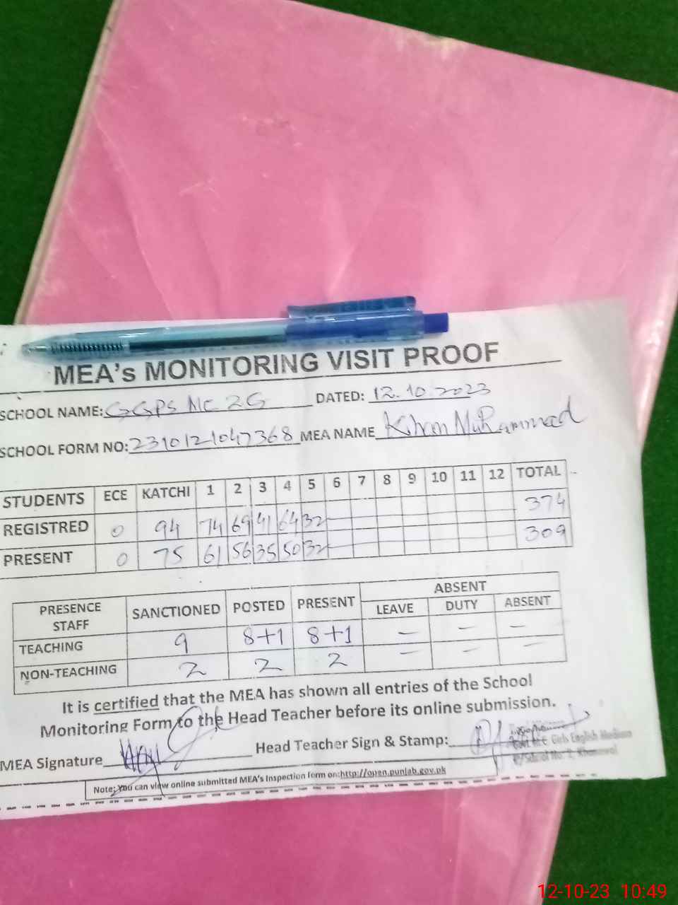 | Attendance Register | Head Teacher | MEA with School | Visit Proof |
