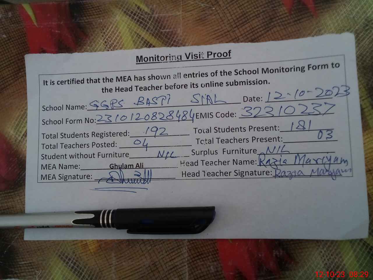 | Attendance Register | Head Teacher | MEA with School | Visit Proof |