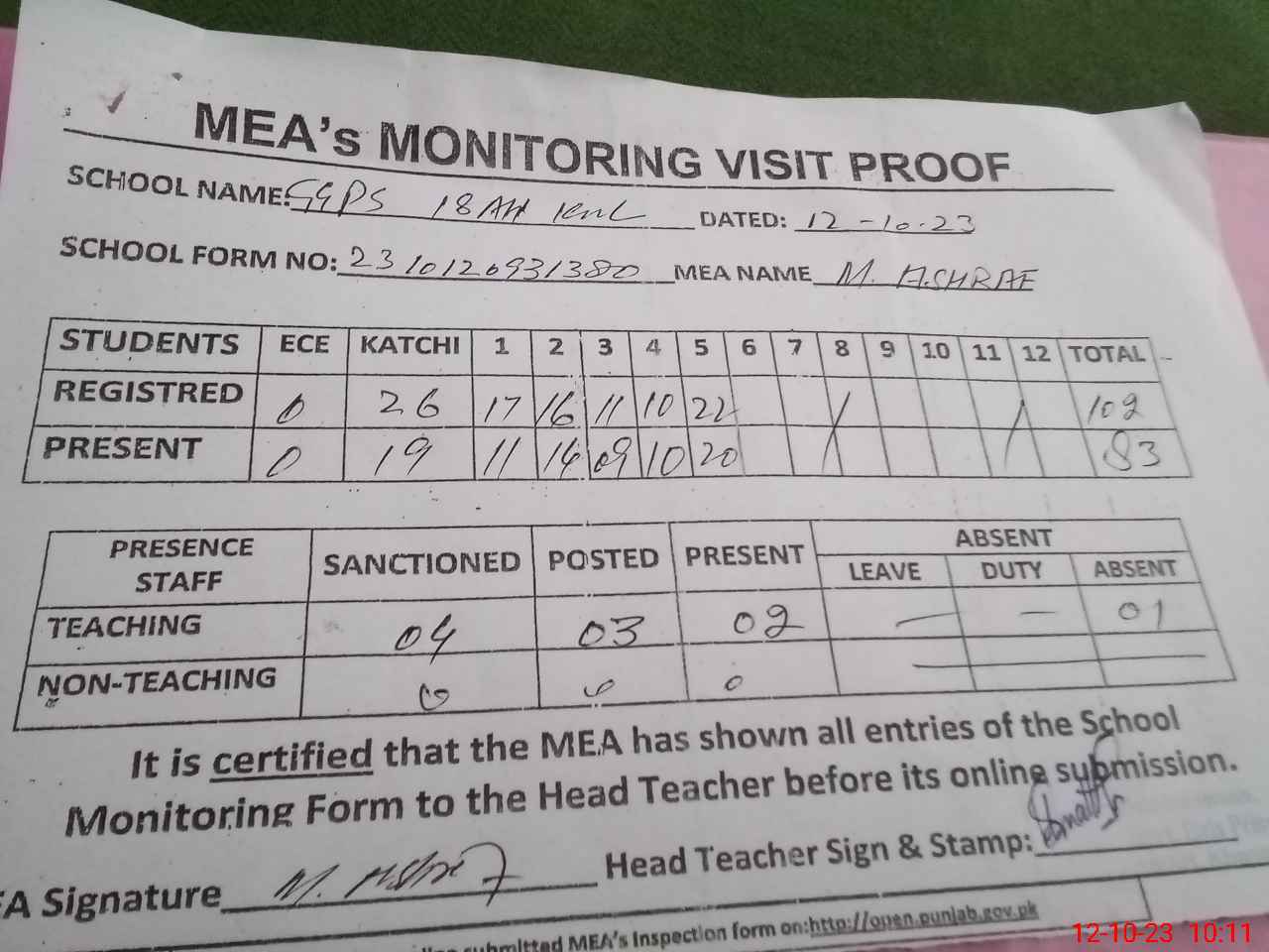 | Attendance Register | Head Teacher | MEA with School | Visit Proof |