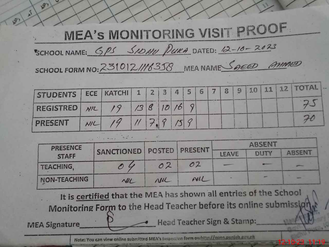 | Attendance Register | Head Teacher | MEA with School | Visit Proof |