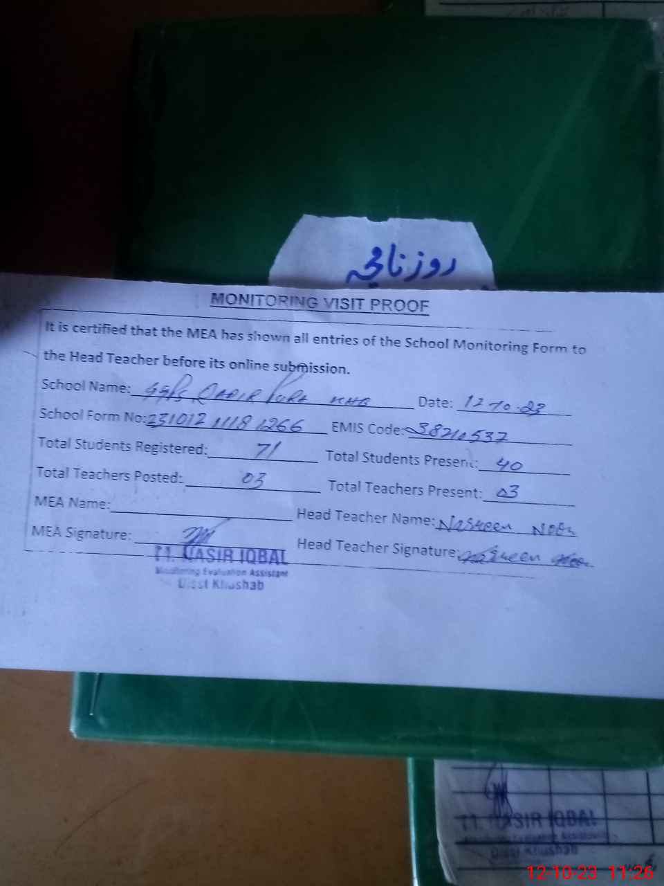 | Attendance Register | Head Teacher | MEA with School | Visit Proof |
