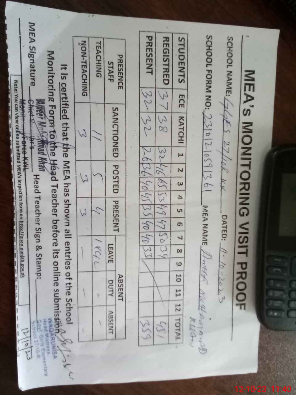 | Attendance Register | Head Teacher | MEA with School | Visit Proof |