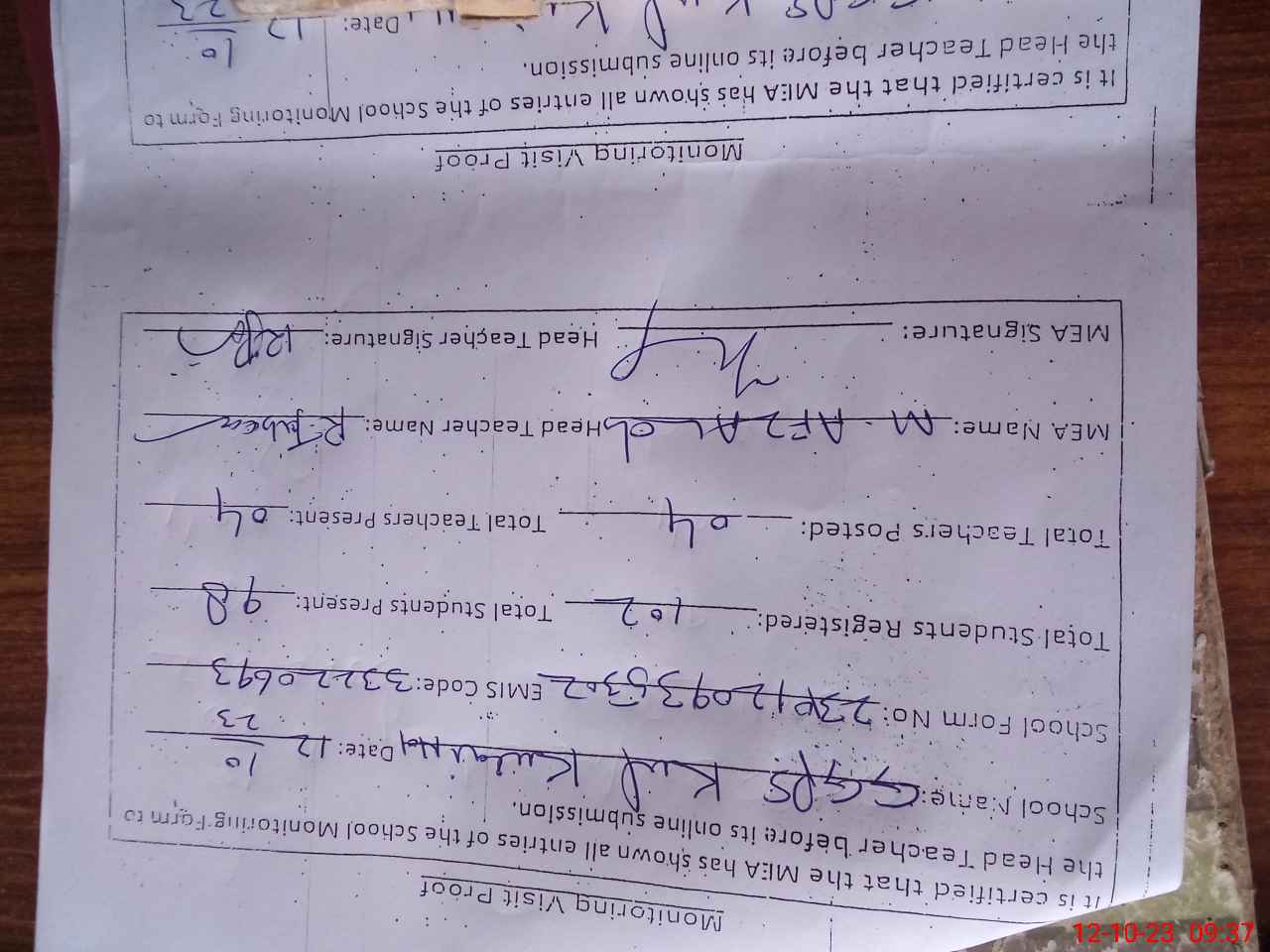 | Attendance Register | Head Teacher | MEA with School | Visit Proof |