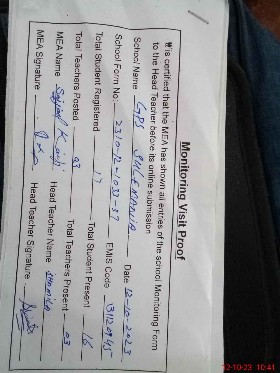 | Attendance Register | Head Teacher | MEA with School | Visit Proof |