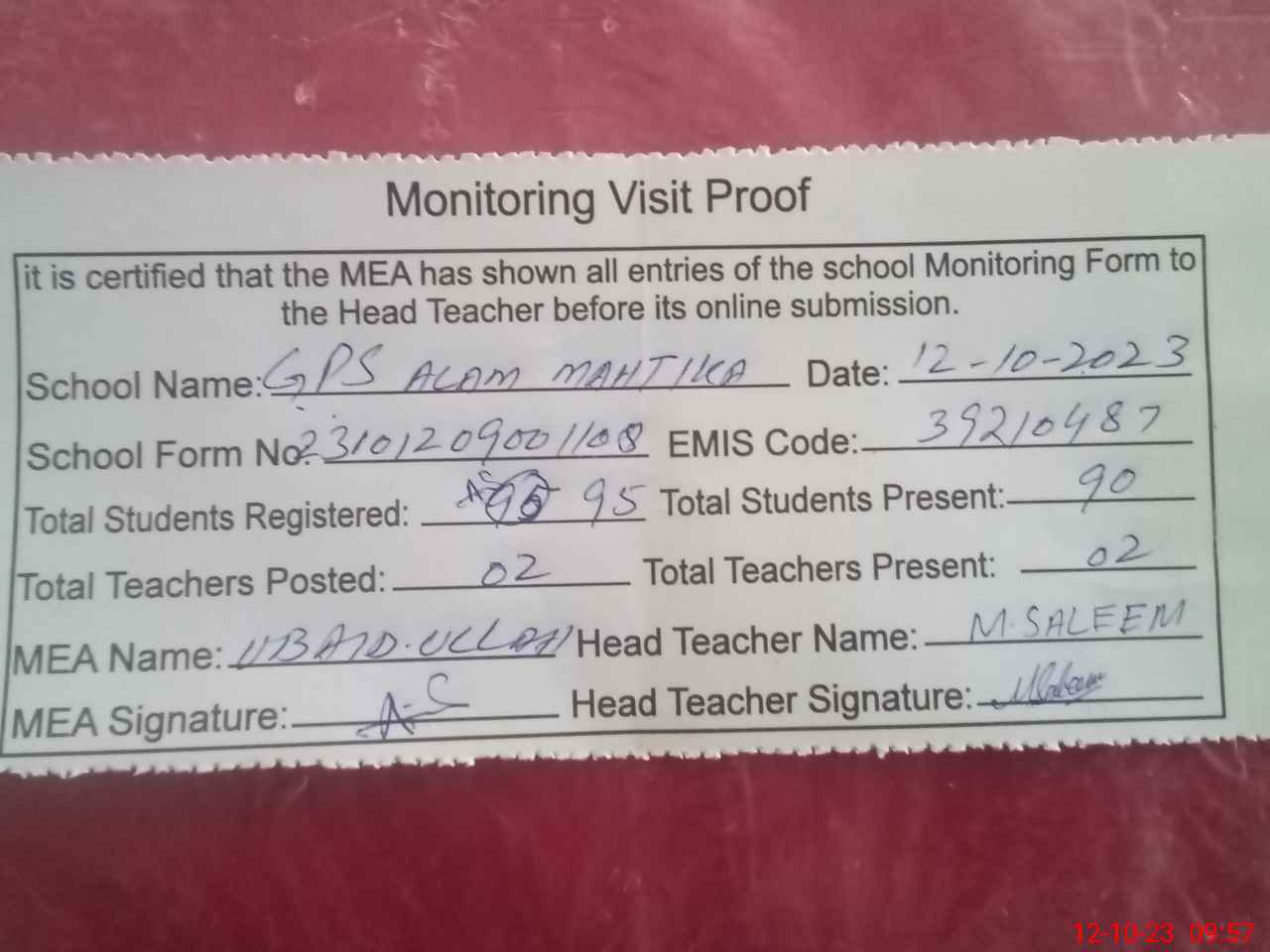 | Attendance Register | Head Teacher | MEA with School | Visit Proof |