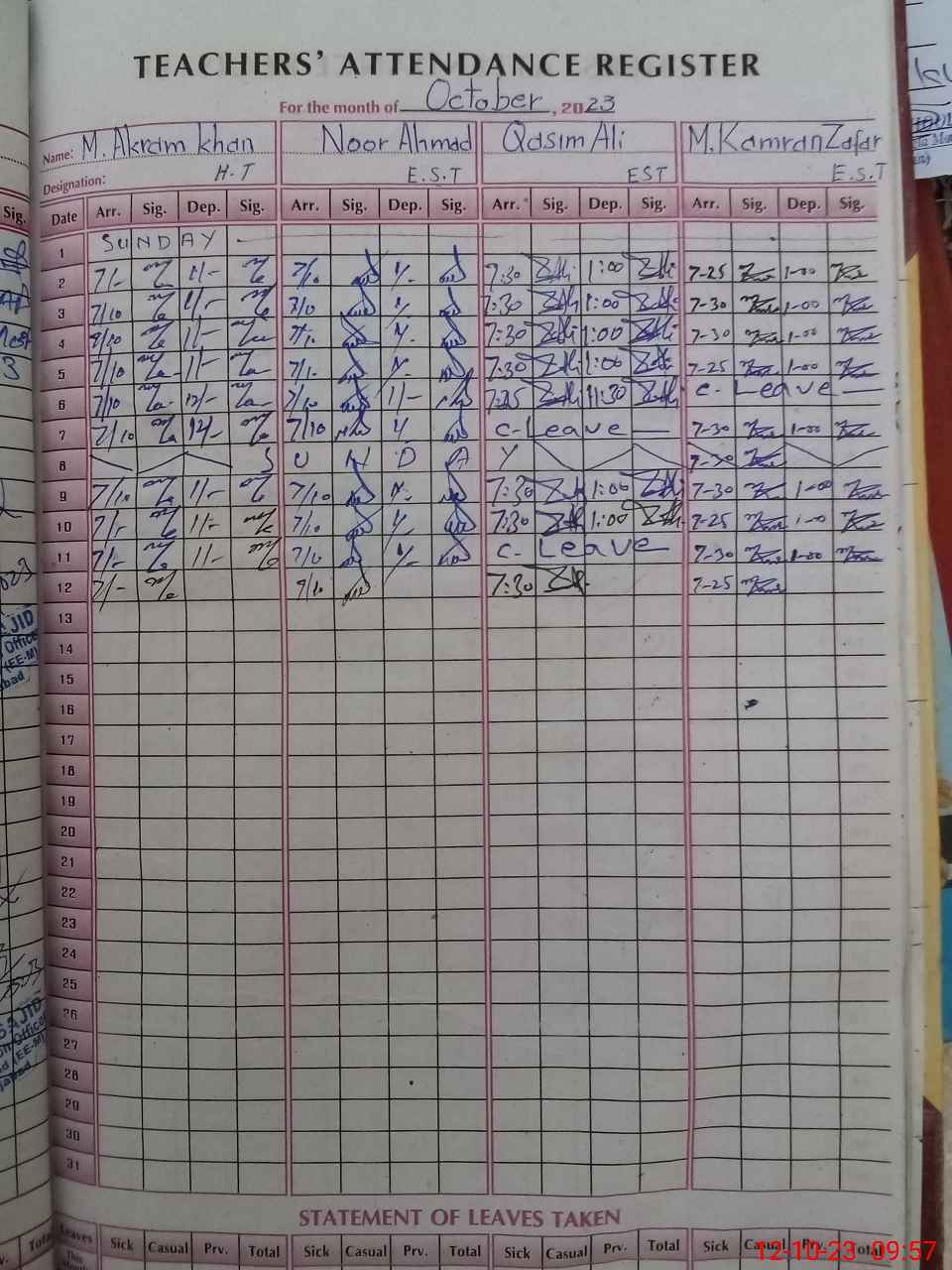 | CNIC | Full Name | Designation | R/C | Absence During Last Calender Month |