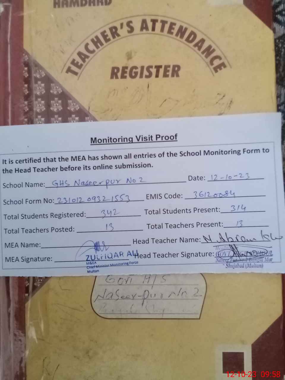 | Attendance Register | Head Teacher | MEA with School | Visit Proof |