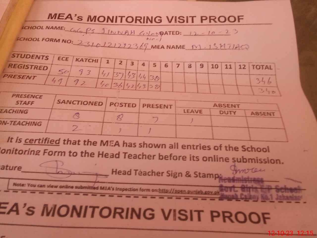 | Attendance Register | Head Teacher | MEA with School | Visit Proof |