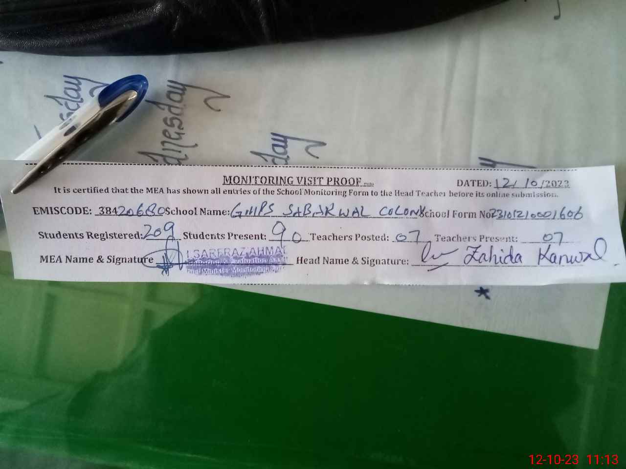| Attendance Register | Head Teacher | MEA with School | Visit Proof |