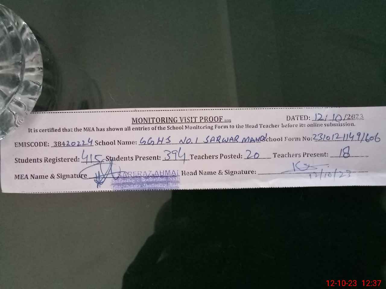 | Attendance Register | Head Teacher | MEA with School | Visit Proof |