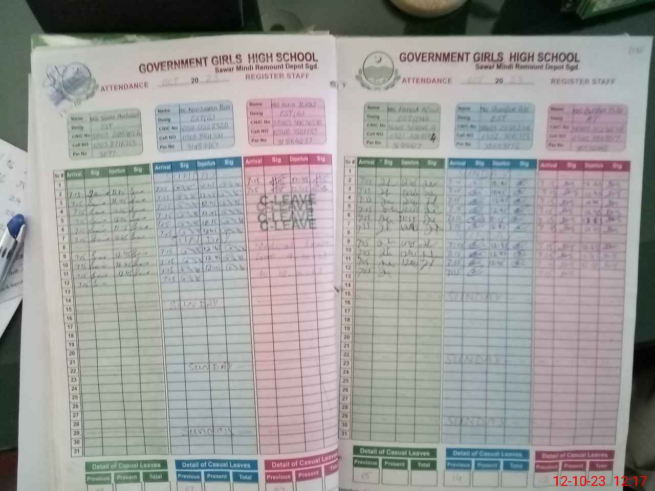 | CNIC | Full Name | Designation | R/C | Absence During Last Calender Month |