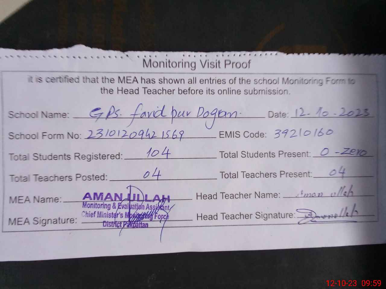 | EMIS Code: 39210160 | Name of School: GPS FARID PUR DOGRAN | |||