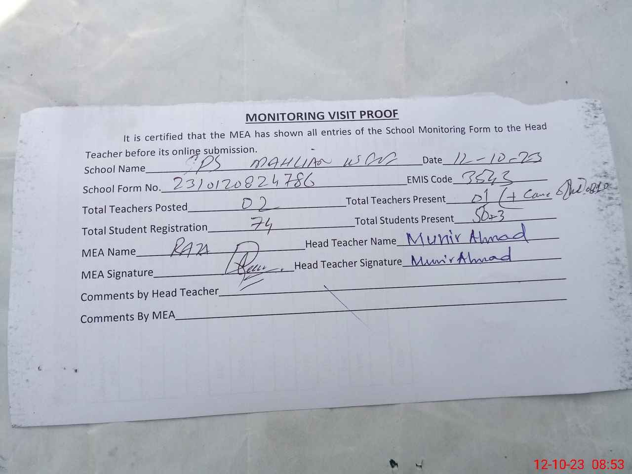 | Attendance Register | Head Teacher | MEA with School | Visit Proof |