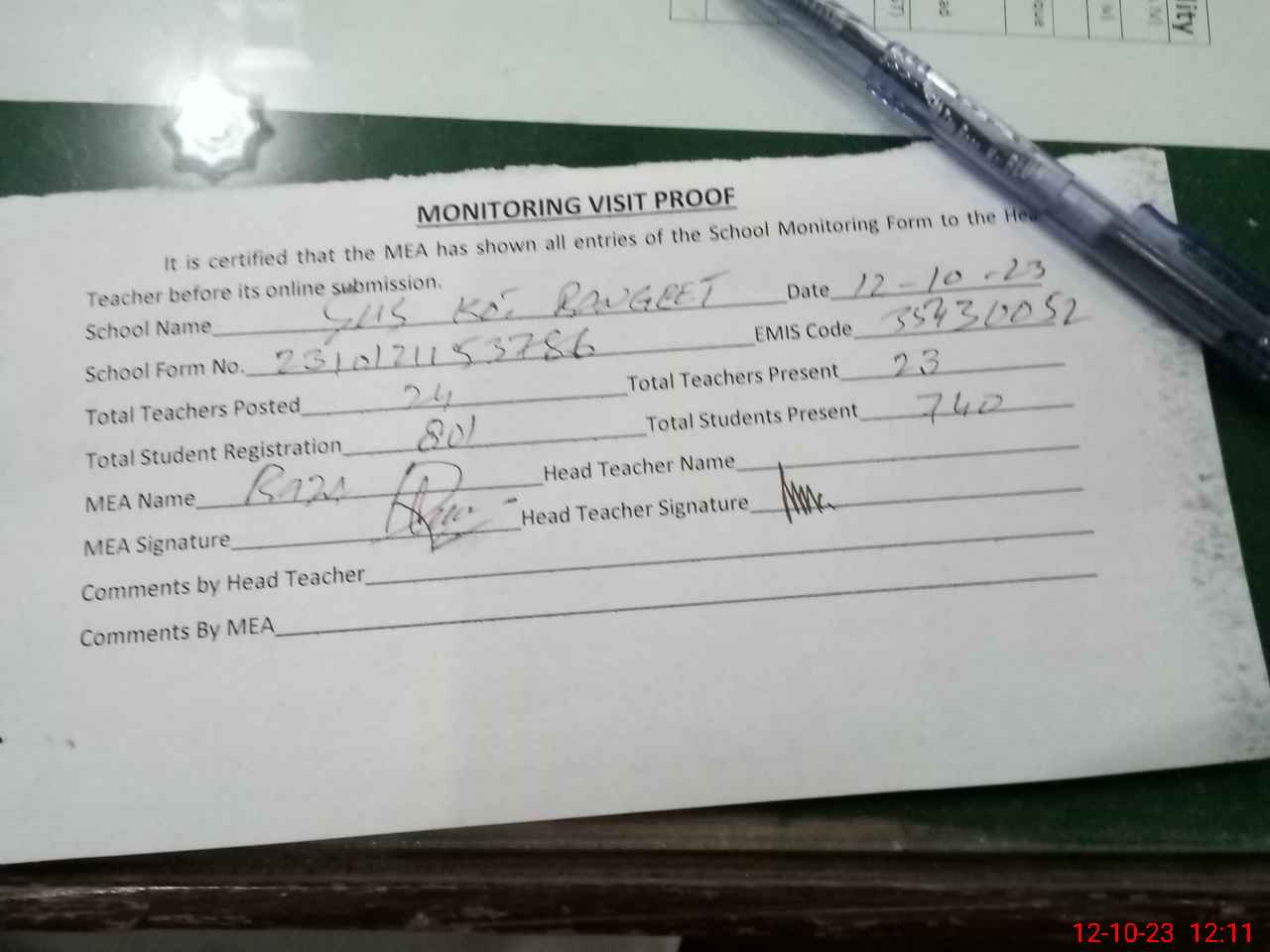 | Attendance Register | Head Teacher | MEA with School | Visit Proof |