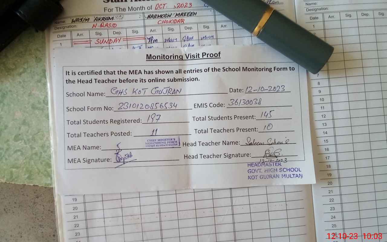 | EMIS Code: 36130038 | Name of School: GHS KOT GUJRAN MULTAN | |||