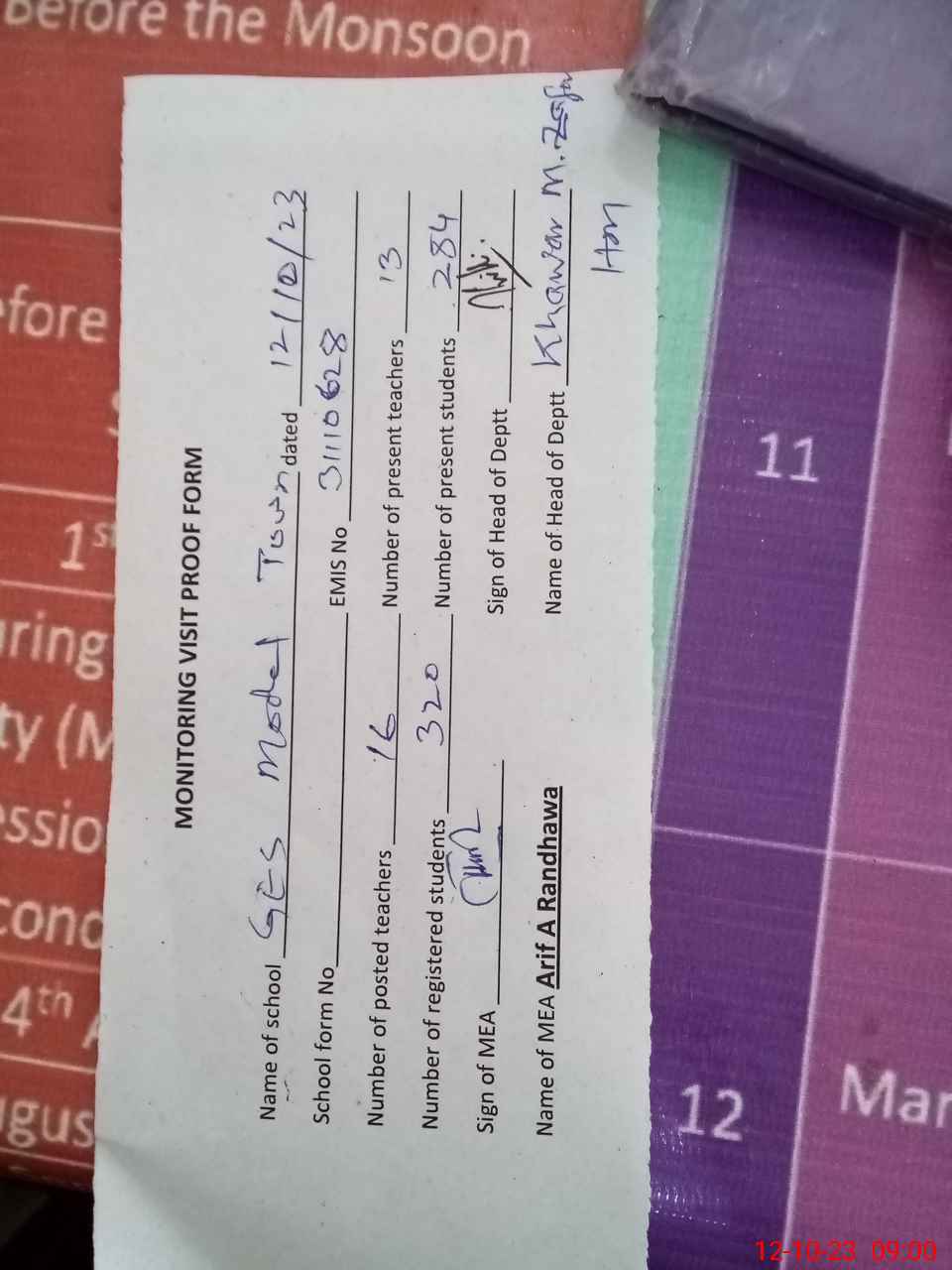 | Monitoring Date: 12-10-2023 | Start Time: 12-10-2023 08:21 AM | End Time: 12-10-2023 09:05 AM | Name of MEA: Mu**** Ar**** No**** BN**** 23 | |