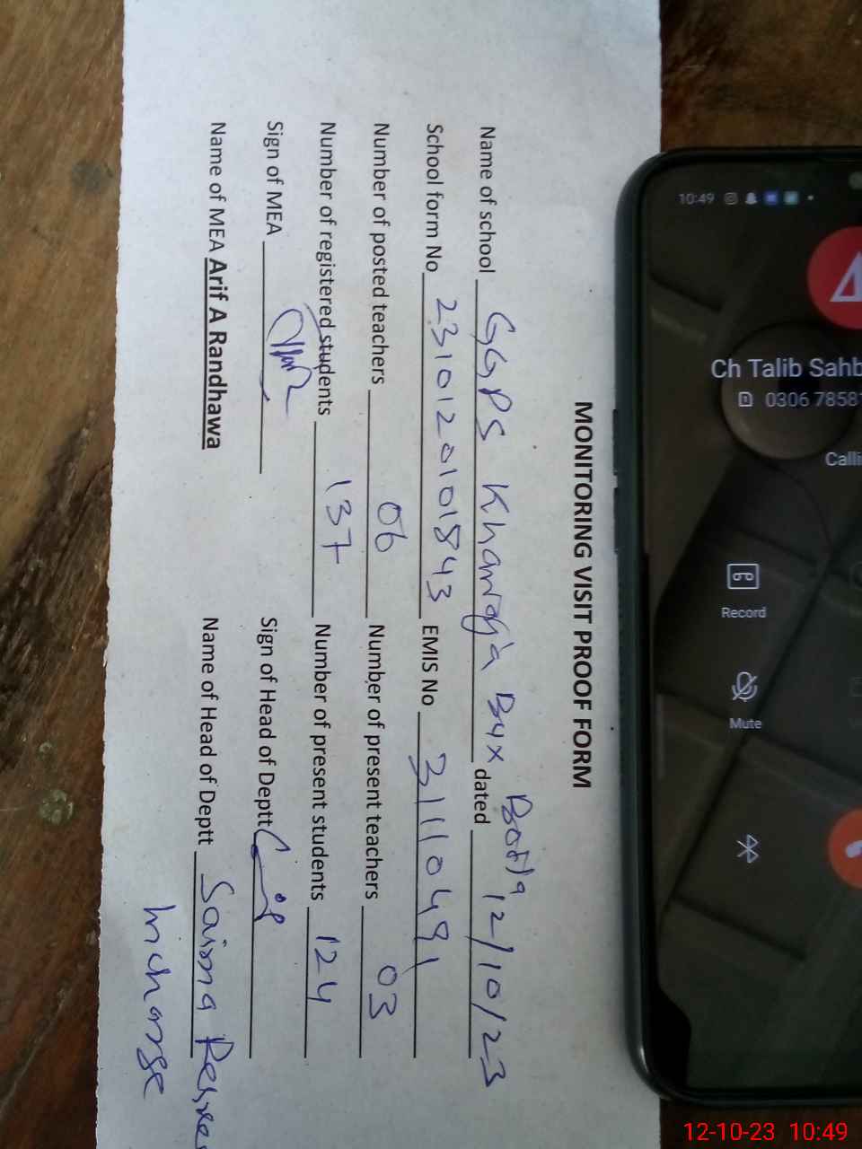| Certified that this School was Inspected by the Undersigned MEA/DMO Today and the Information Stated Above is as Per Record. | |||||
