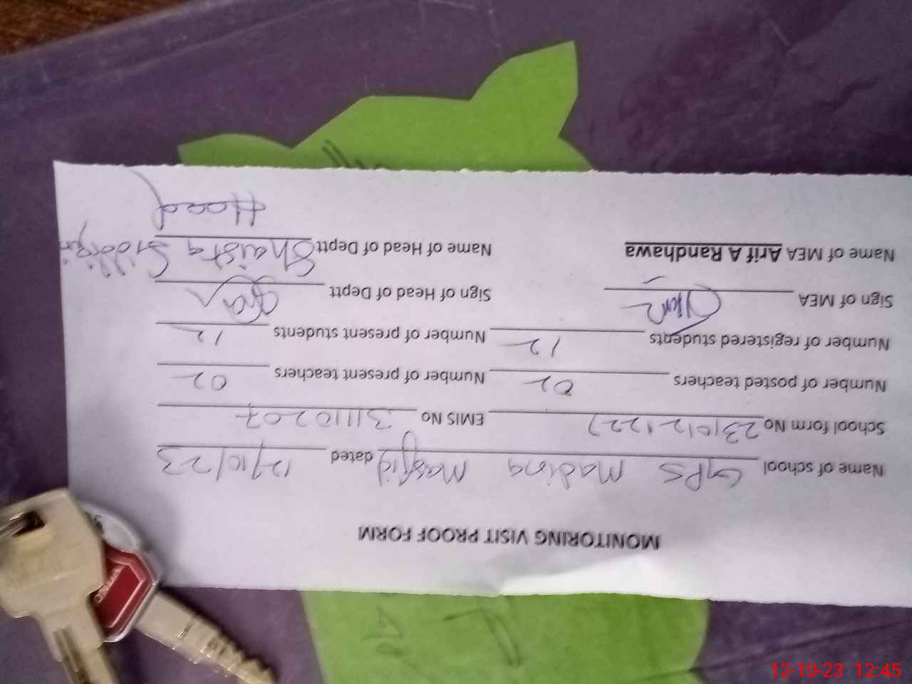 | Monitoring Date: 12-10-2023 | Start Time: 12-10-2023 12:27 PM | End Time: 12-10-2023 12:47 PM | Name of MEA: Mu**** Ar**** No**** BN**** 23 | |