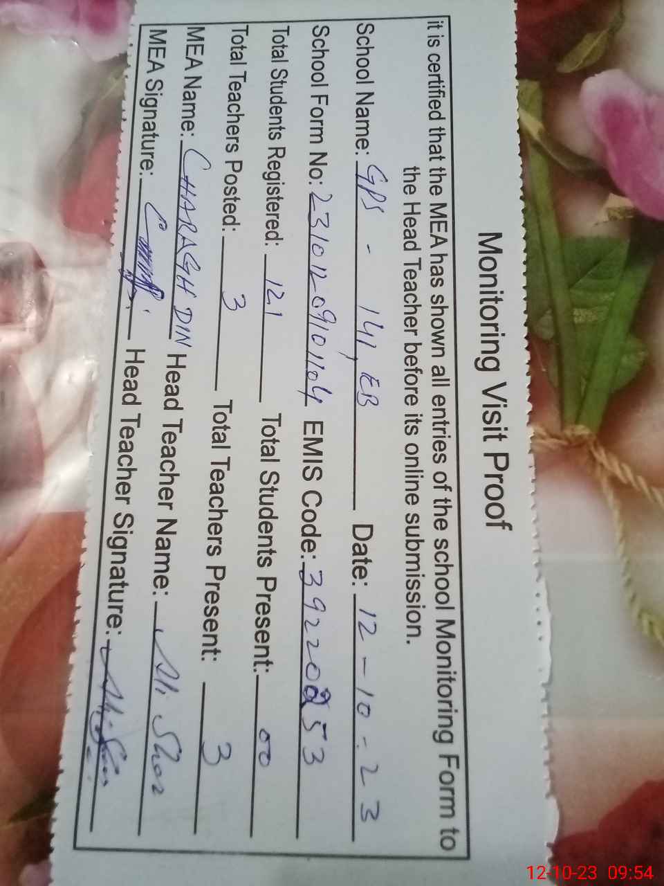 | Attendance Register | Head Teacher | MEA with School | Visit Proof |