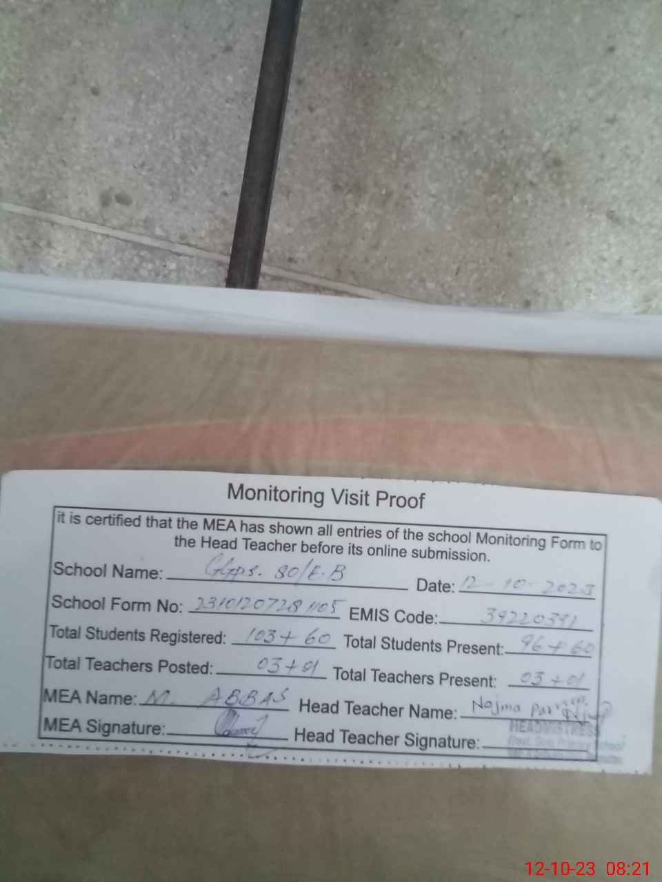 | Attendance Register | Head Teacher | MEA with School | Visit Proof |