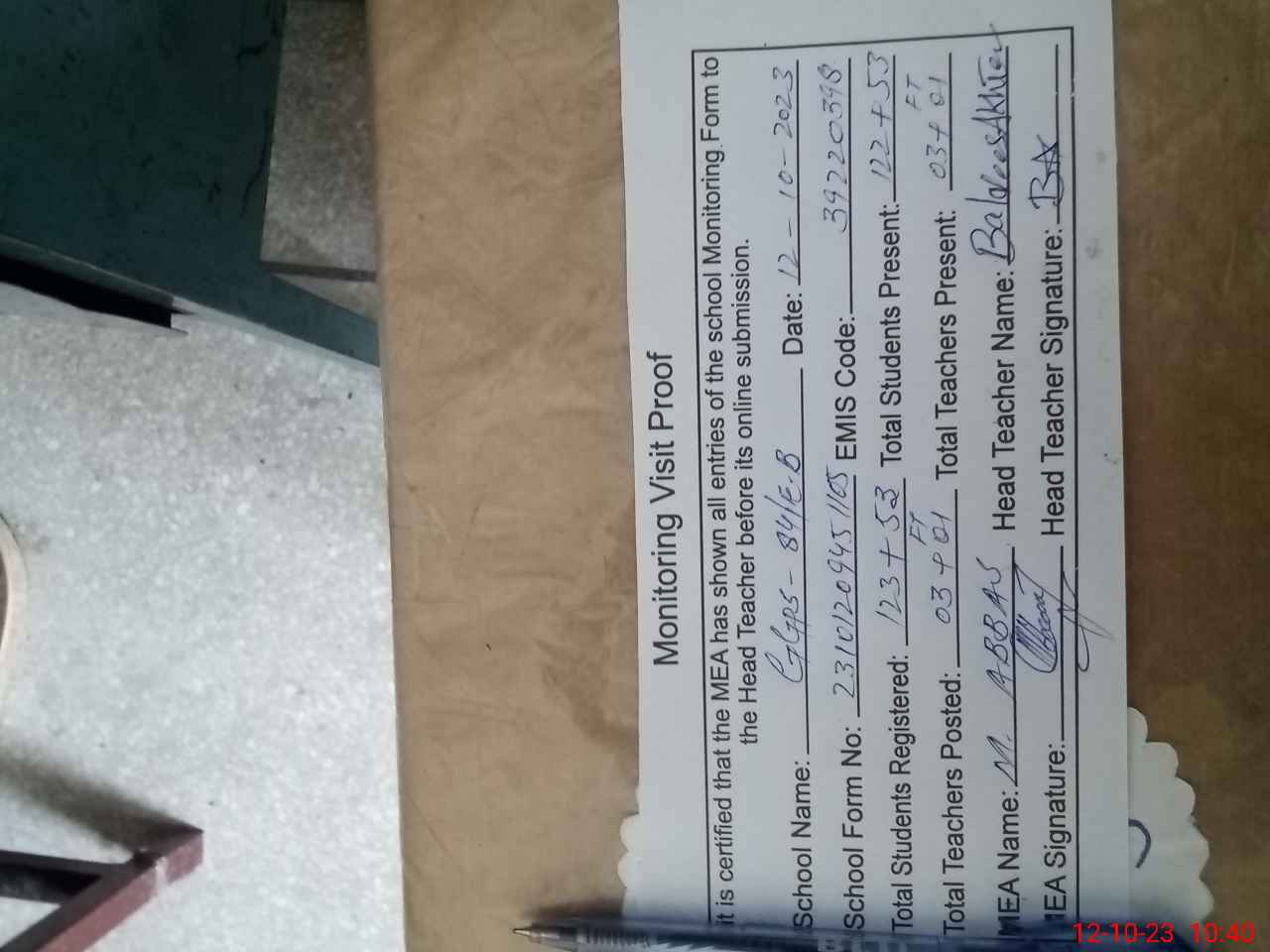 | Attendance Register | Head Teacher | MEA with School | Visit Proof |
