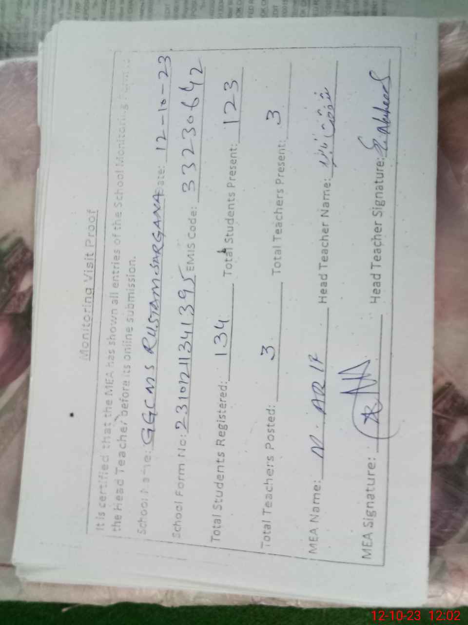 | Attendance Register | Head Teacher | MEA with School | Visit Proof |