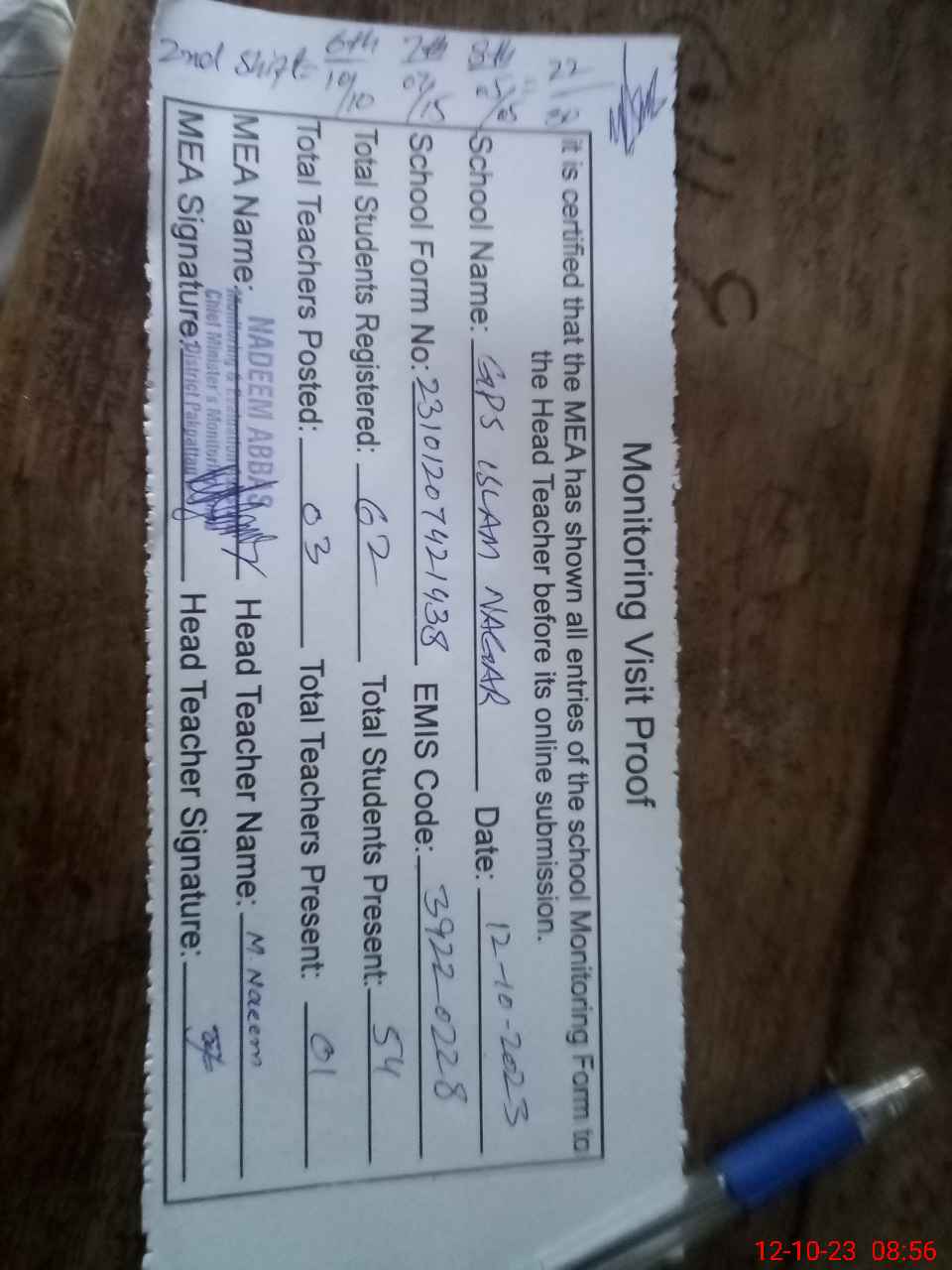 | Attendance Register | Head Teacher | MEA with School | Visit Proof |