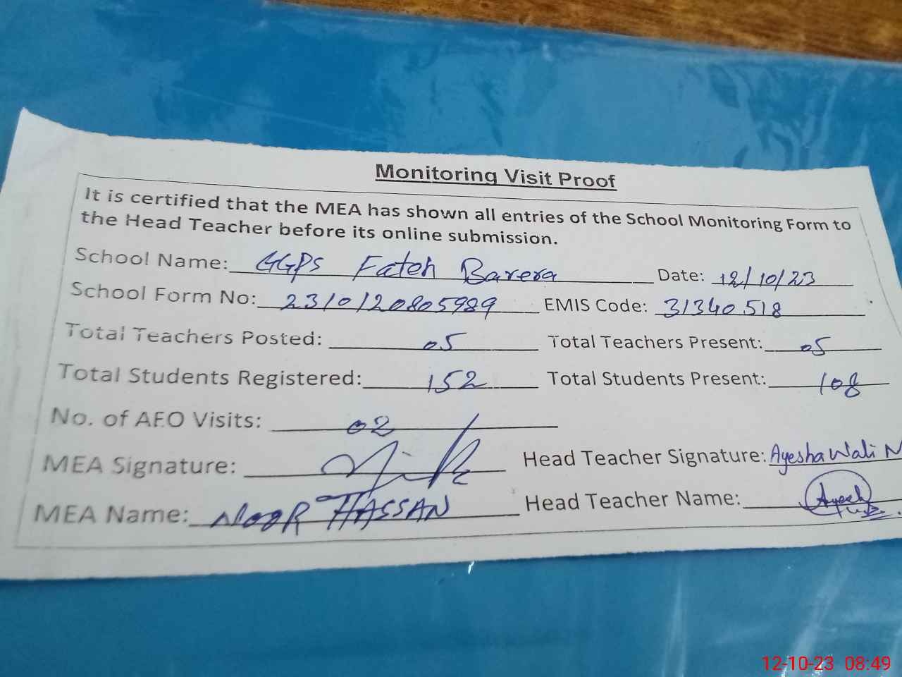 | Attendance Register | Head Teacher | MEA with School | Visit Proof |