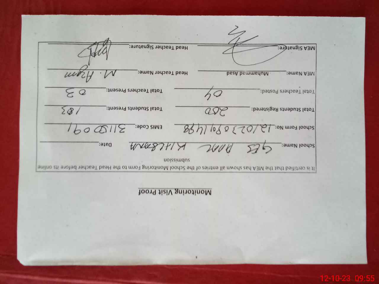 | Attendance Register | Head Teacher | MEA with School | Visit Proof |