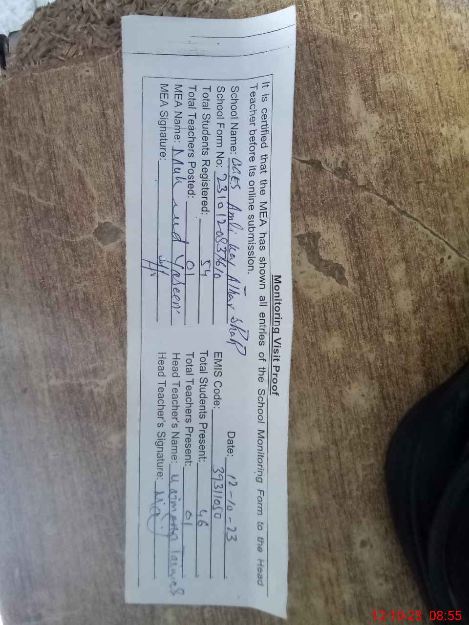 | Monitoring Date: 12-10-2023 | Start Time: 12-10-2023 08:37 AM | End Time: 12-10-2023 08:56 AM | Name of MEA: MU**** YA**** | |