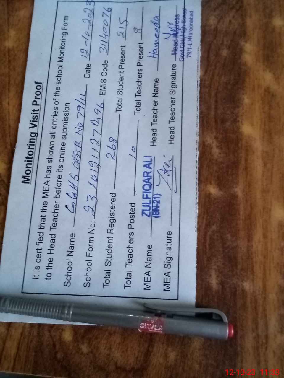 | Attendance Register | Head Teacher | MEA with School | Visit Proof |