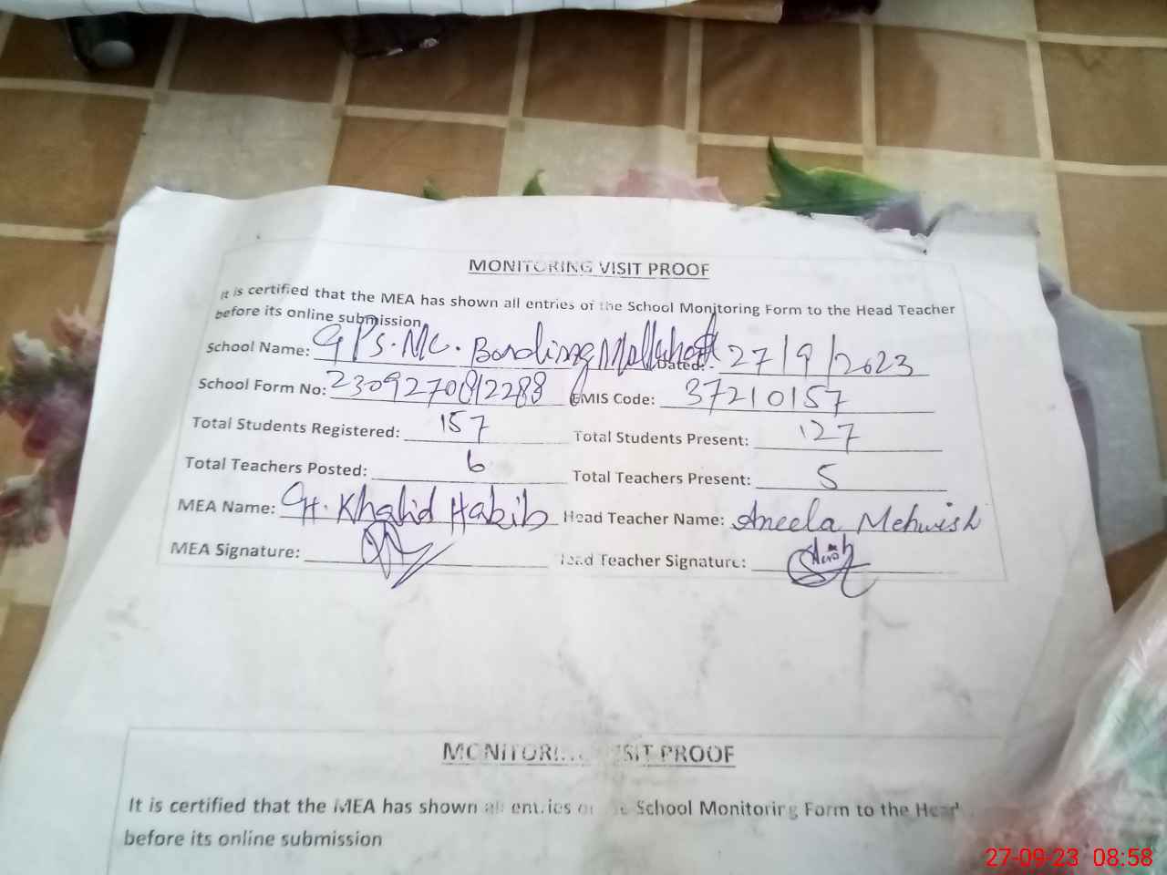 | Attendance Register | Head Teacher | MEA with School | Visit Proof |
