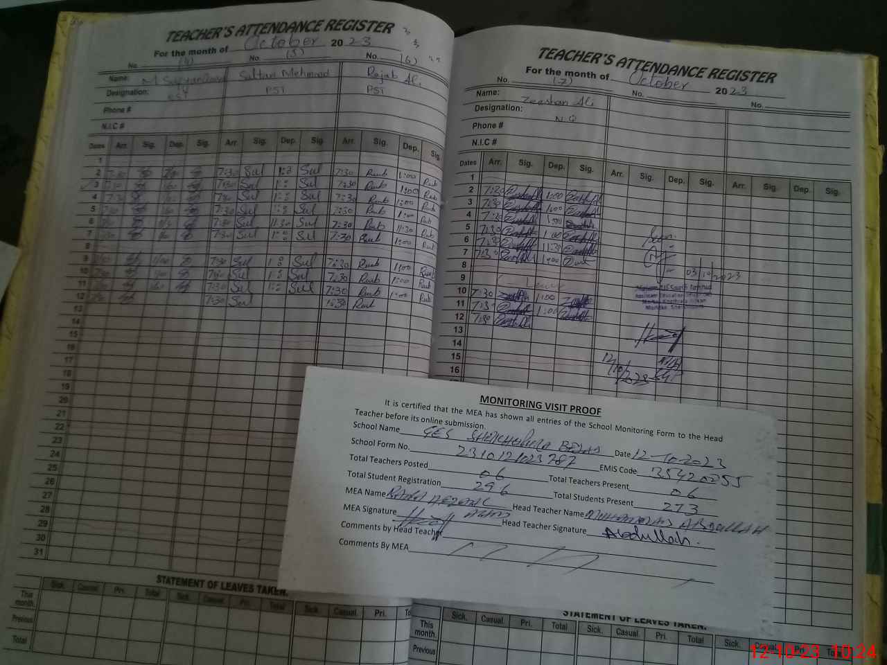 | Attendance Register | Head Teacher | MEA with School | Visit Proof |