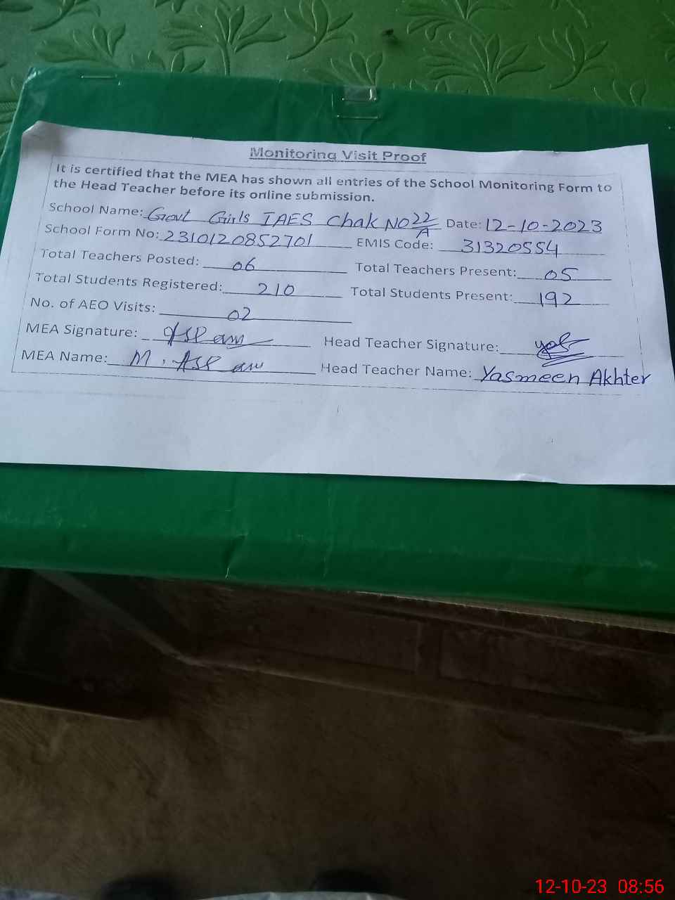 | Attendance Register | Head Teacher | MEA with School | Visit Proof |