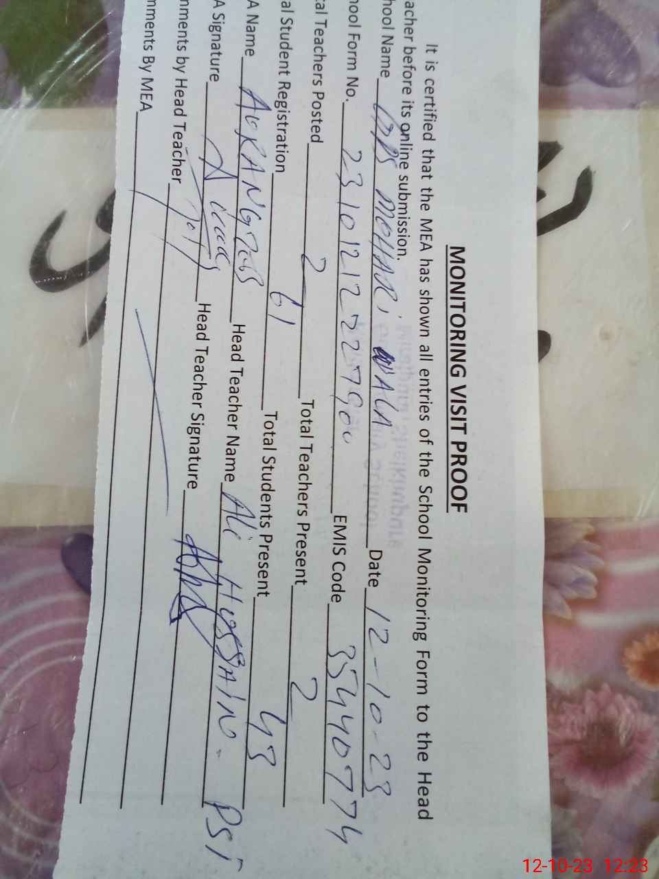 | Attendance Register | Head Teacher | MEA with School | Visit Proof |