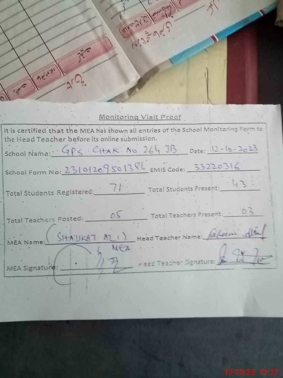 | Attendance Register | Head Teacher | MEA with School | Visit Proof |
