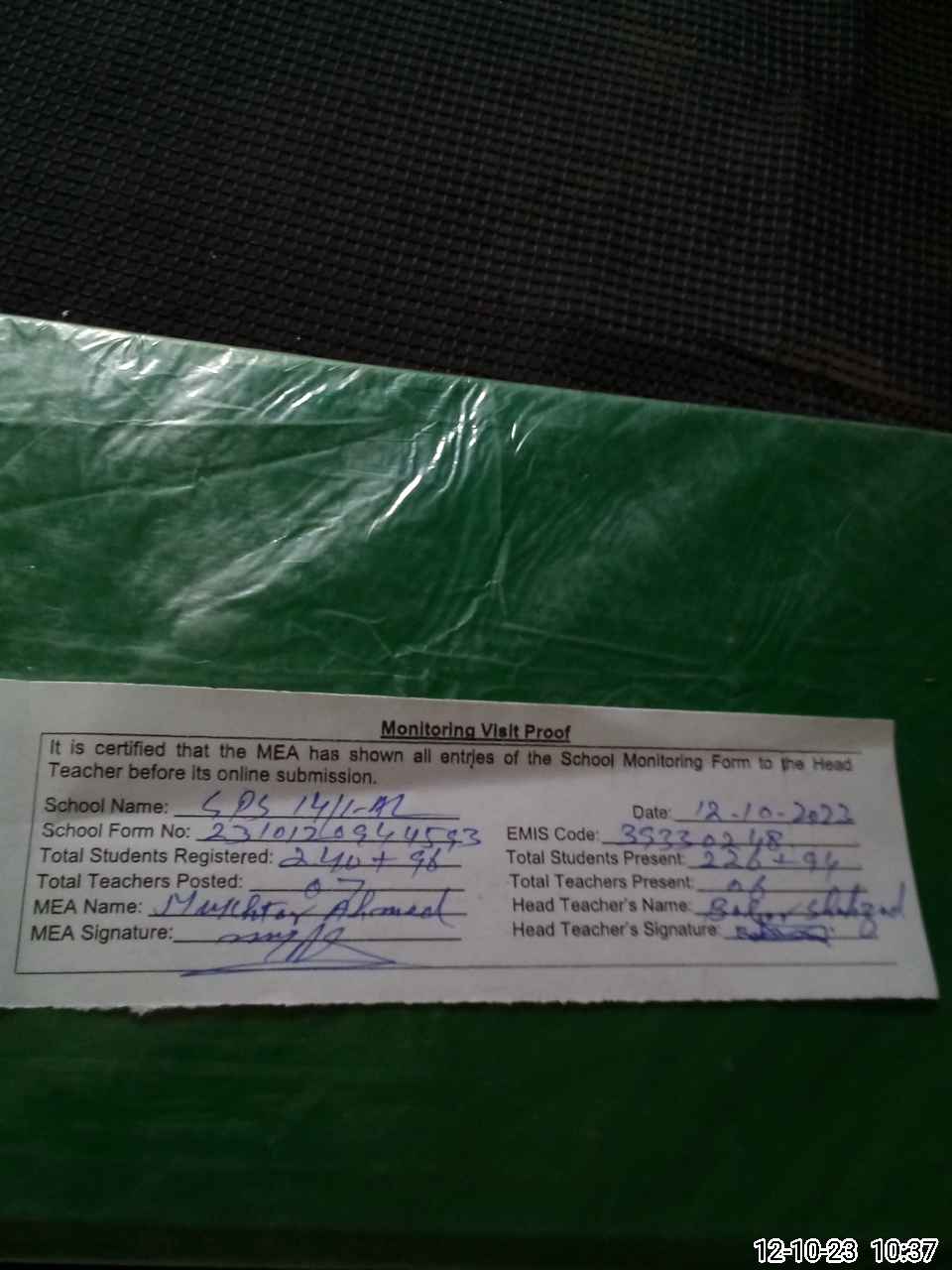 | Certified that this School was Inspected by the Undersigned MEA/DMO Today and the Information Stated Above is as Per Record. | |||||