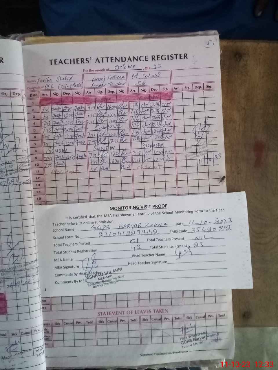 | Attendance Register | Head Teacher | MEA with School | Visit Proof |